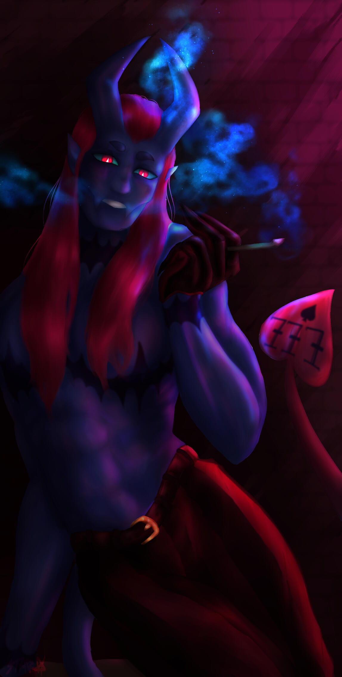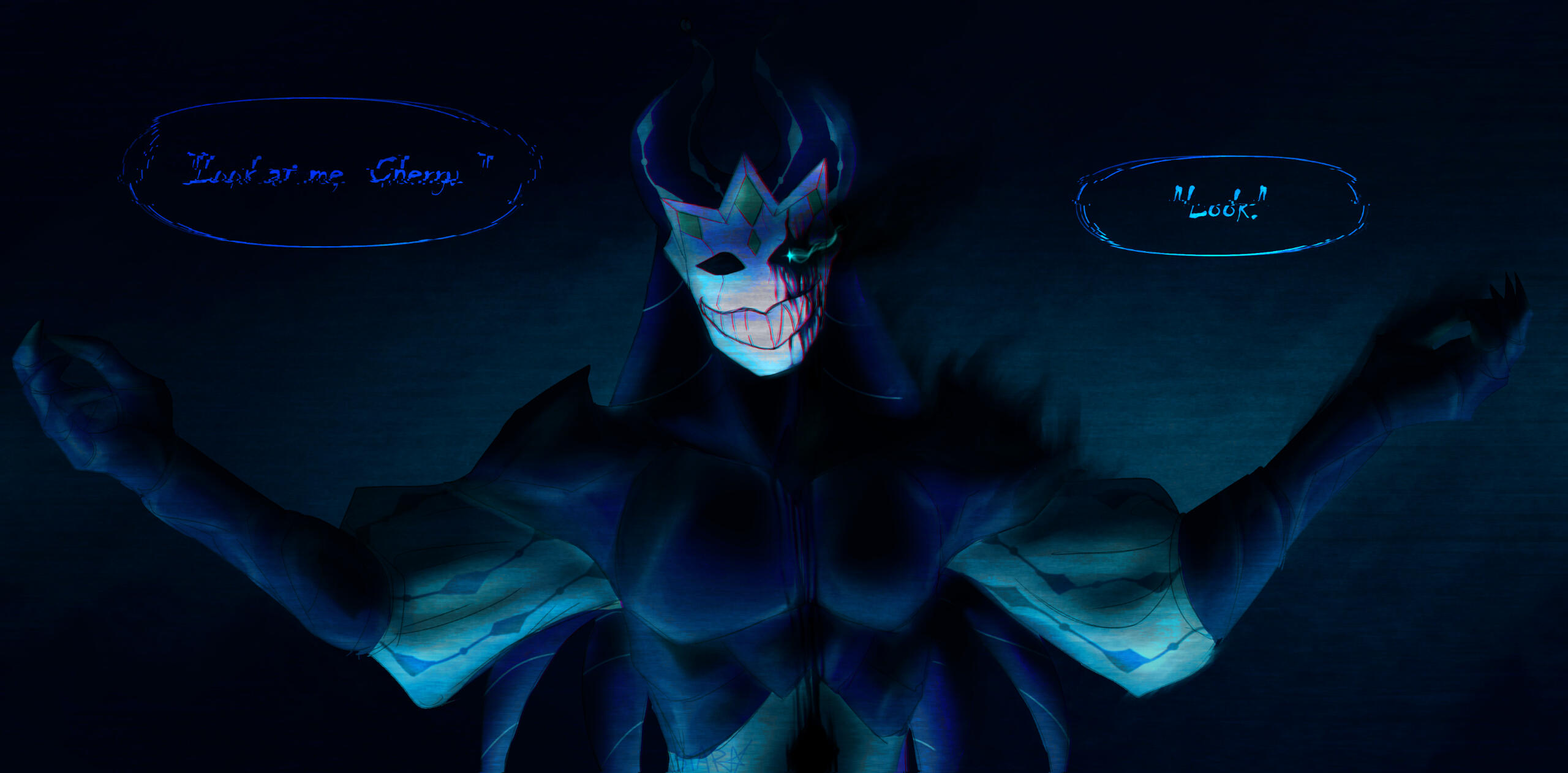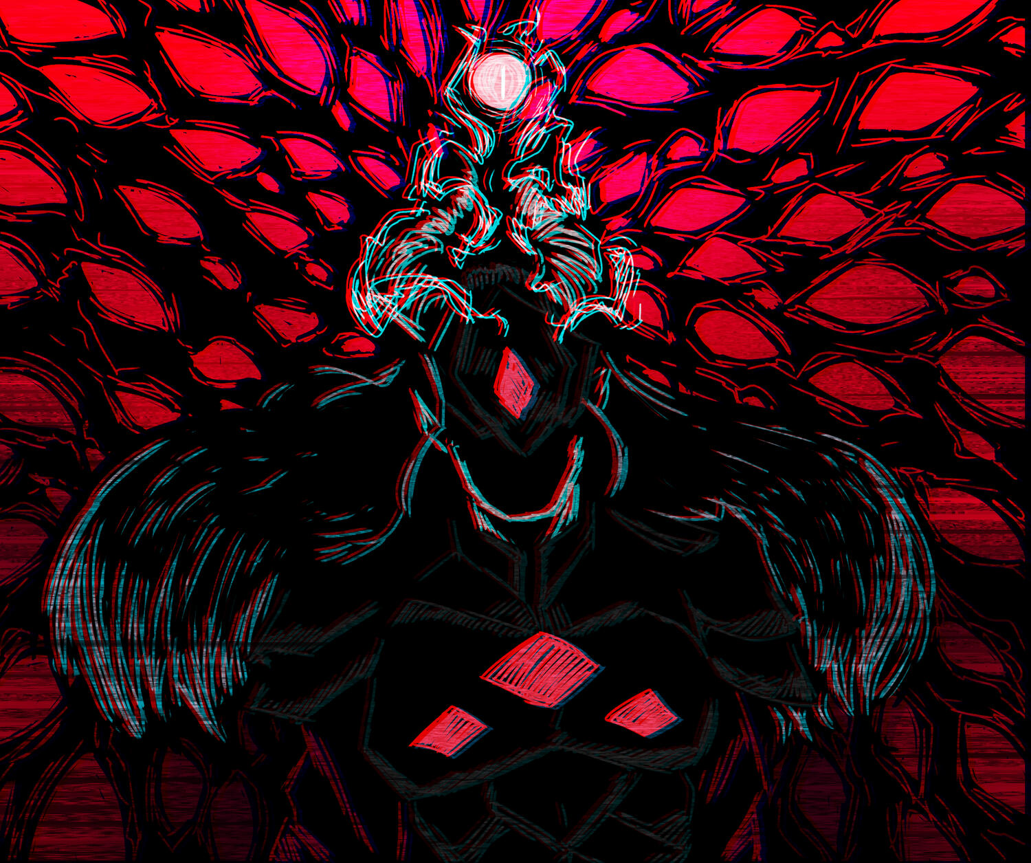 -Behind you, the eyes start to form rapidly, outlining the form of a tall, horned figure. You can feel its presence, but the terror that keeps you petrified prevents you from turning around. The only thing you see is a wicked red grin in the mirror opposite you in the room- but then everything goes quiet.