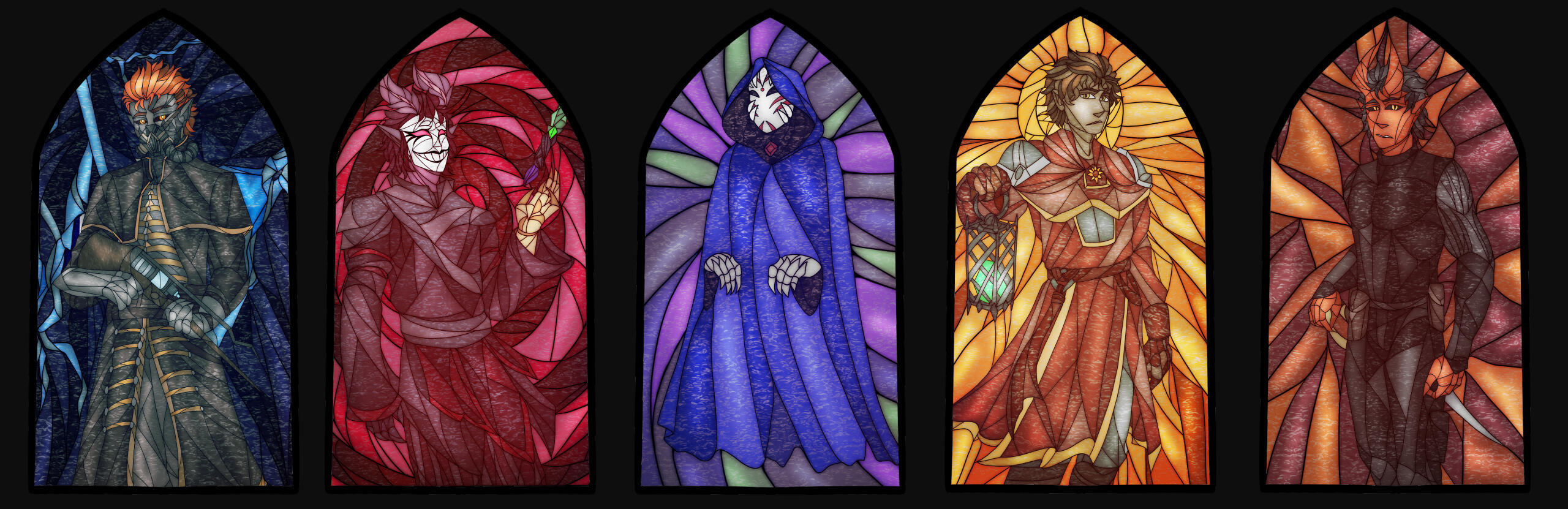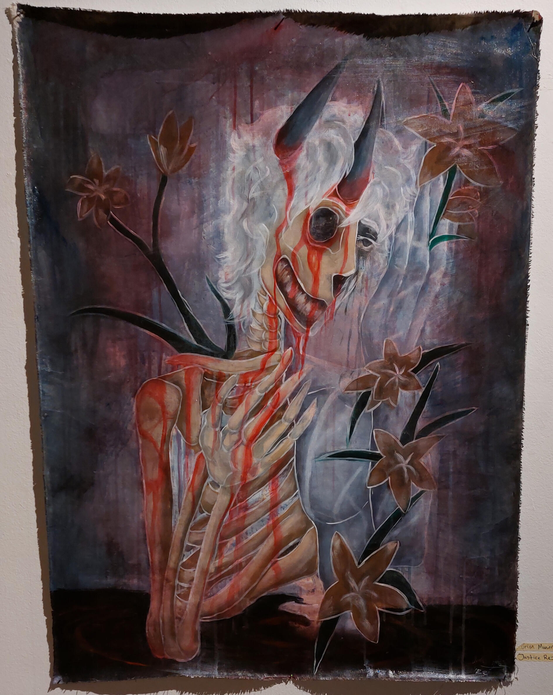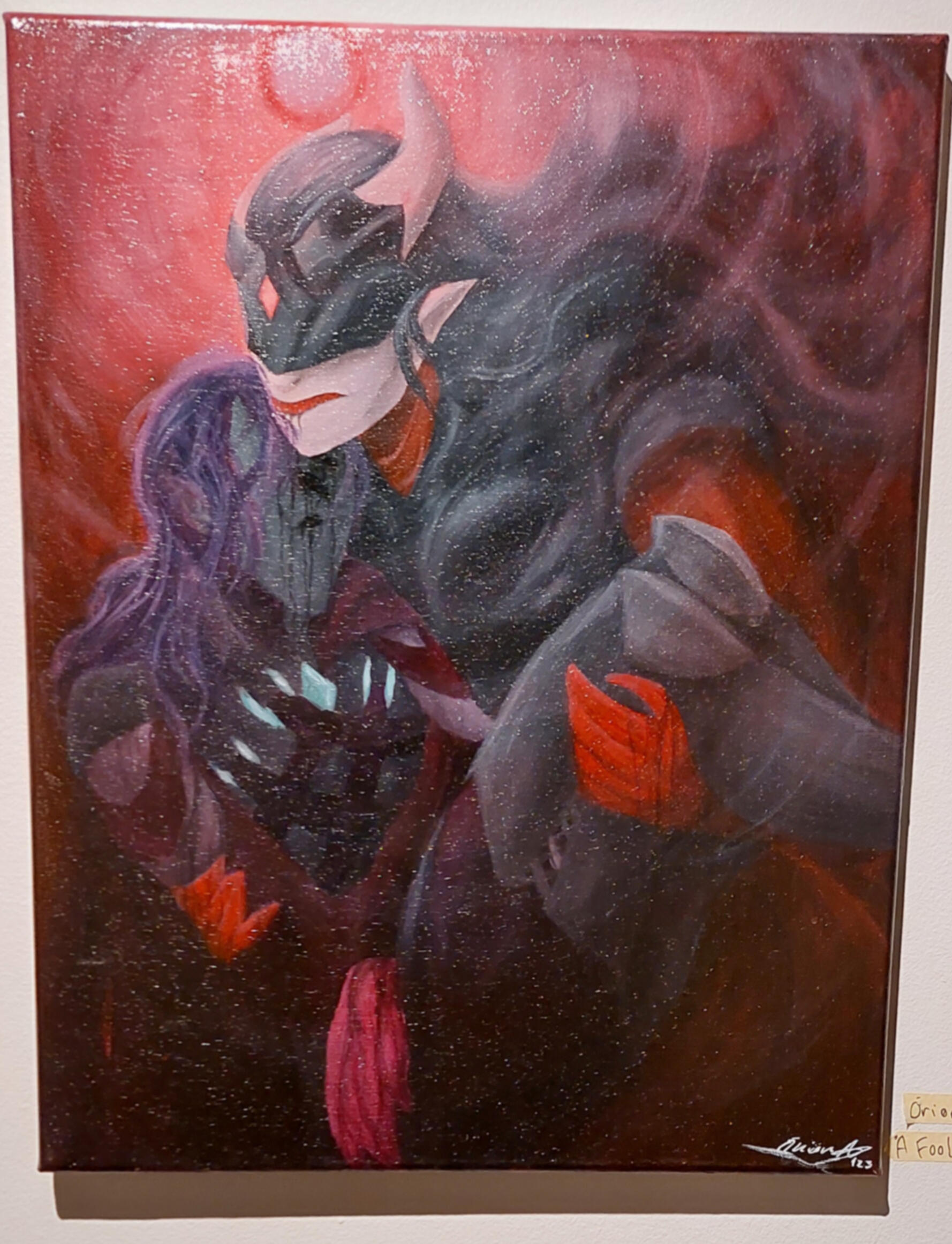 An acrylic piece depicting the character Legion Bladeward, the incarnation of Justice. He is half-skeletal, but the flowers symbolize growth, potential, and hope. They are not based on a particular species.